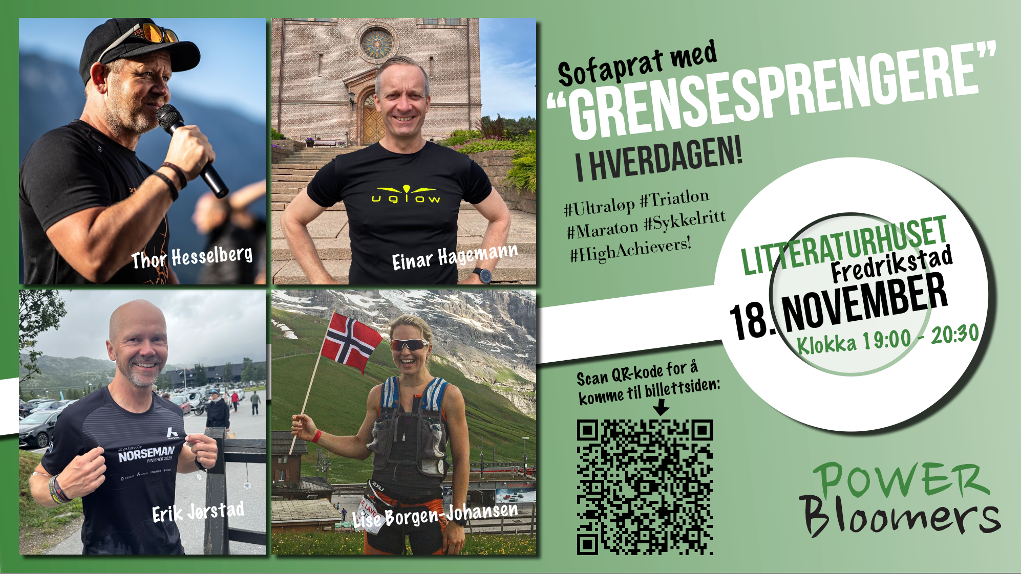 Vi kan nesten ikke vente til vårt første event “Grensesprengere i hverdagen” som er 18. november. Vi er så heldige å ha med oss Thor Hesselberg, Einar Hagemann og Lise Borgen-Johansen, som sammen med Erik vil dele litt fra sine hverdagshistorier med trening og forberedelser til ultraløp, triatlon med mere. Det ved siden av fulle jobber og familieliv.